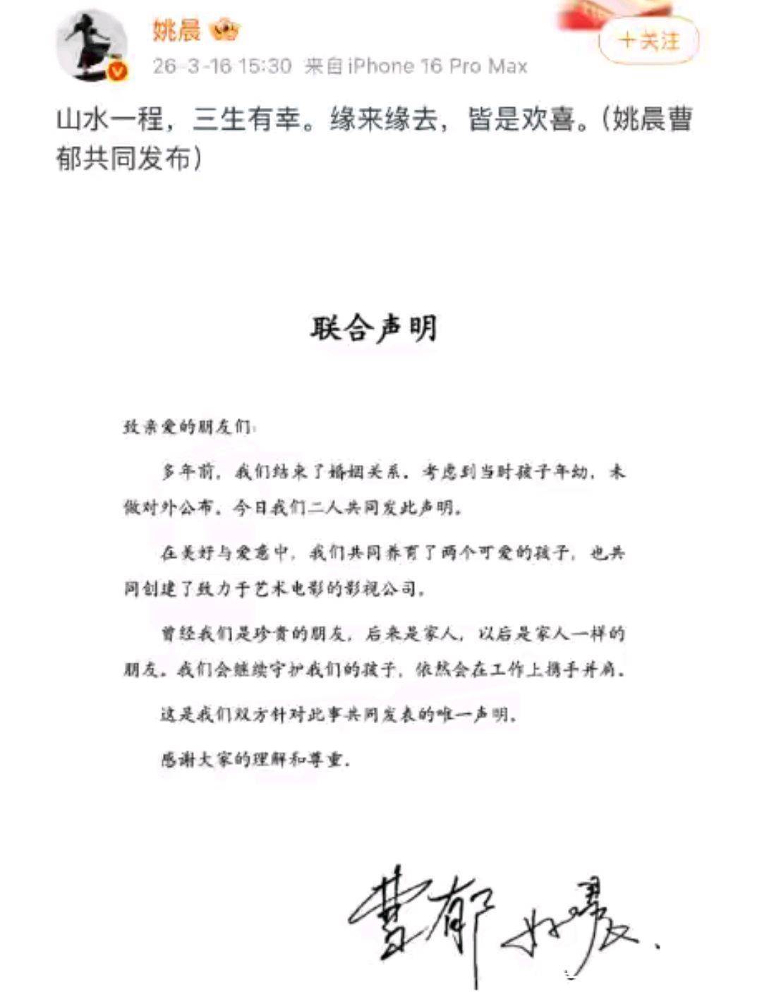 3月16日,姚晨和曹郁共同宣布,他们离婚了!