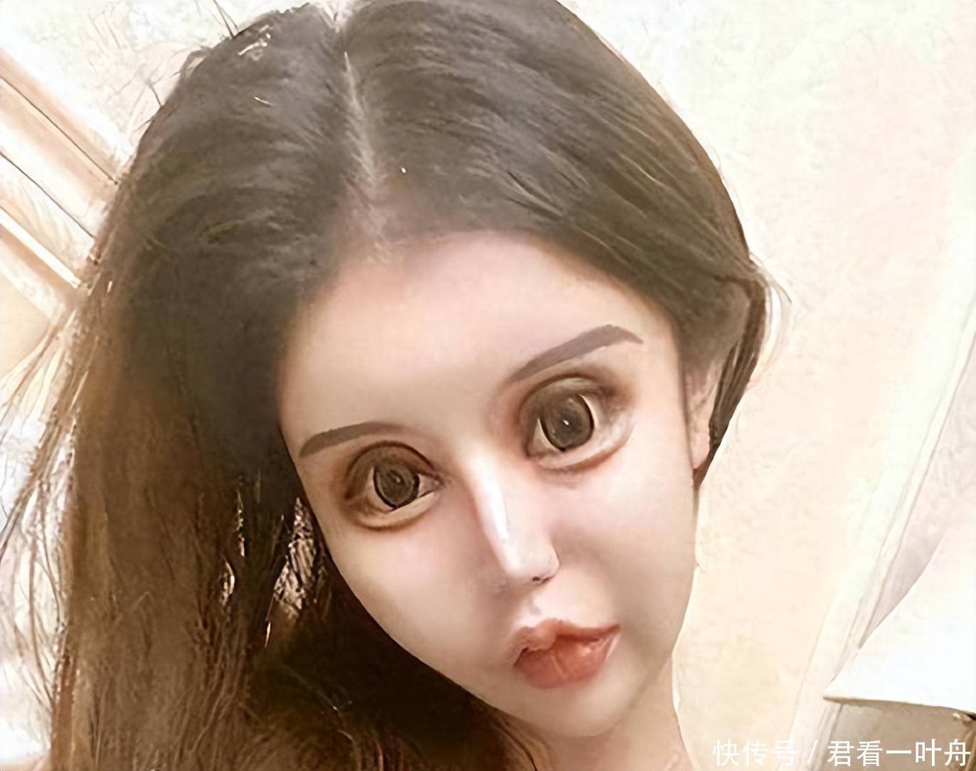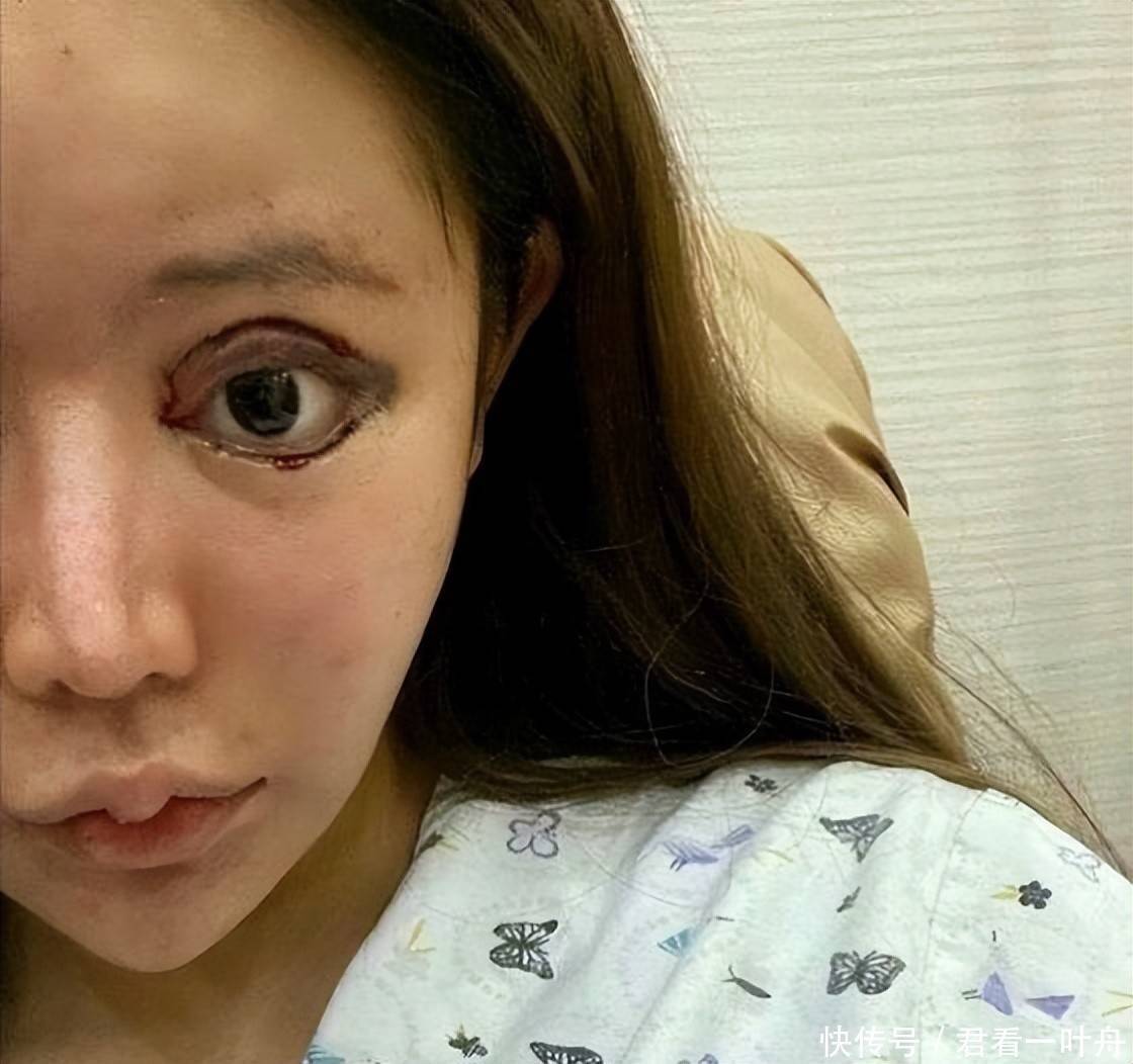 她多次的开眼角手术,让她的眼窝深陷,眼睛外凸。晚上睡觉的时候由于眼角太大,眼睛也只能半睁着,活脱脱的像个僵尸。